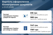 31.12.2025 УВАГА!!! З 01.01.2026 змінюється вартість оформлення паспорта громадянина України у формі картки та паспорта громадянина України для виїзду за кордонГромадяни, які оплатили вартість до 31.12.2025 і здійснюватимуть оформлення адміністративної послуги з 01.01.2026, мають здійснити відповідну доплату на суму збільшення вартості адміністративної послуги. |